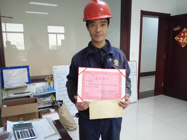 在今年的2015年度“技行武进”职业技能焊工竞赛中,我公司员工邹利俊、丁渝踊跃报名参加,在面临生产任务紧张的前提下,仍然克服困难,别人下班后,自己在厂里苦修内功,^终,功夫不负有心人,邹利俊荣获焊工竞赛三等奖(后附荣誉证书),并荣获武进区社保局、武进区总工会奖金1000元,丁渝获鼓励奖。
