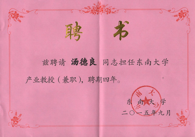 2016年1月20日,江苏圣乐董事长汤德良出席了东南大学产业教授聘任仪式,东南大学校长、中国工程院院士张广军为汤德良董事长颁发了产业教授聘书。