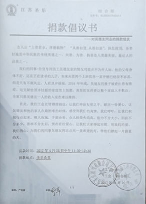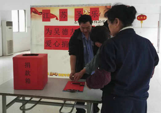 病魔无情,人间有情!圣乐工会得知情况后,跟公司领导商量,要帮一把,一是对吴德友同志认定为困难职工,向上级工会申请补助;二是发动公司全体员工对吴德友同志进行爱心捐款。4月20日,工会向全体员工发起倡议,于2017年4月25日举行现场捐款活动,活动得到了公司大力支持。当天,公司老总汤德良当场捐款9000元,其他员工积极响应,慷慨解囊,当场筹得善款19600多元。