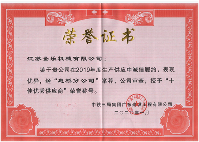 2020年1月4日,在《中铁三局广东公司二届四次职代会暨2020年工作会议》中,三局广东公司介绍了19年的成果及表彰了公司内部优秀员工、优秀供应商、优秀先进集体等。江苏圣乐机械有限公司的名称在会场中响起,三局领导人致谢了所有获奖集体和单位、员工,特别是优秀供应商集体,感谢在过去几年里,给广东公司的极大支持和配合。新的一年,希望受表彰单位再接再厉,再创佳绩,实现合作共赢,共谋发展。